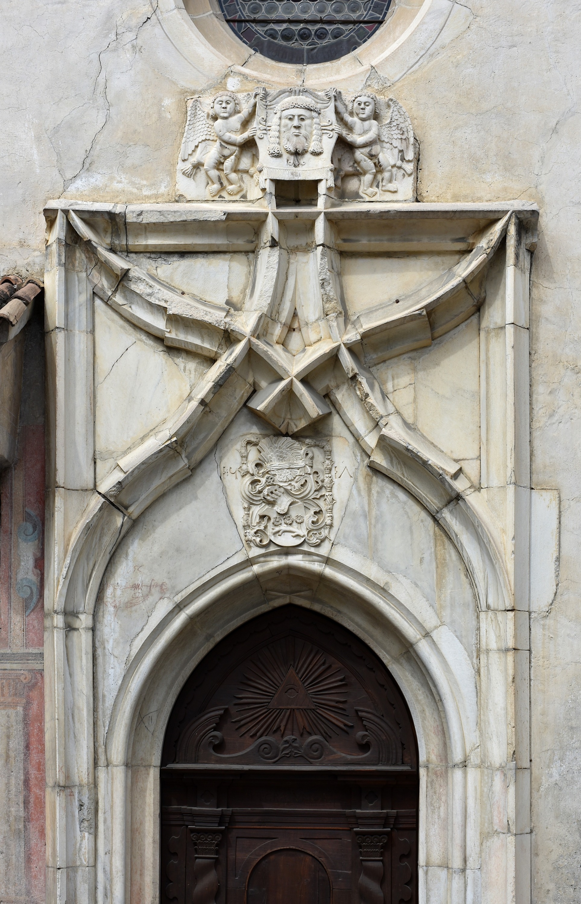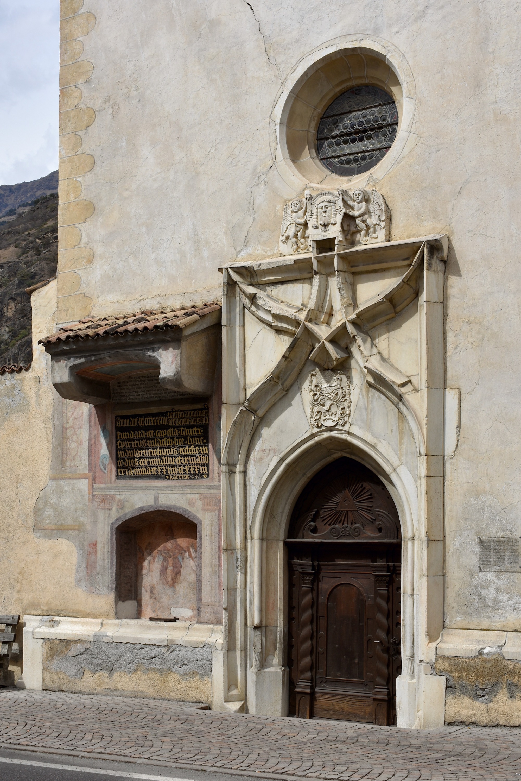 Das Hauptportal zur Kirche enstand 1517. Über dem Spitzbogen überkreuzen sich zwei Kielbogen. Dort, wo die Bögen des Kiels ihre Richtung ändern, wird der "alte" Bogen jeweils noch etwas weiter geführt, bevor er unvermittelt abbricht, und der "neue" Bogen beginnt schon etwas früher. Ein spätgotisches Spiel, als sollten die Konstruktionslinien sichtbar gemacht werden. Im Wappen ist die Stifterfamilie der Kirche, die Annenberger, verewigt. Über dem Spitz des Kielbogens halten zwei Engel das Schweisstuch Jesu'.