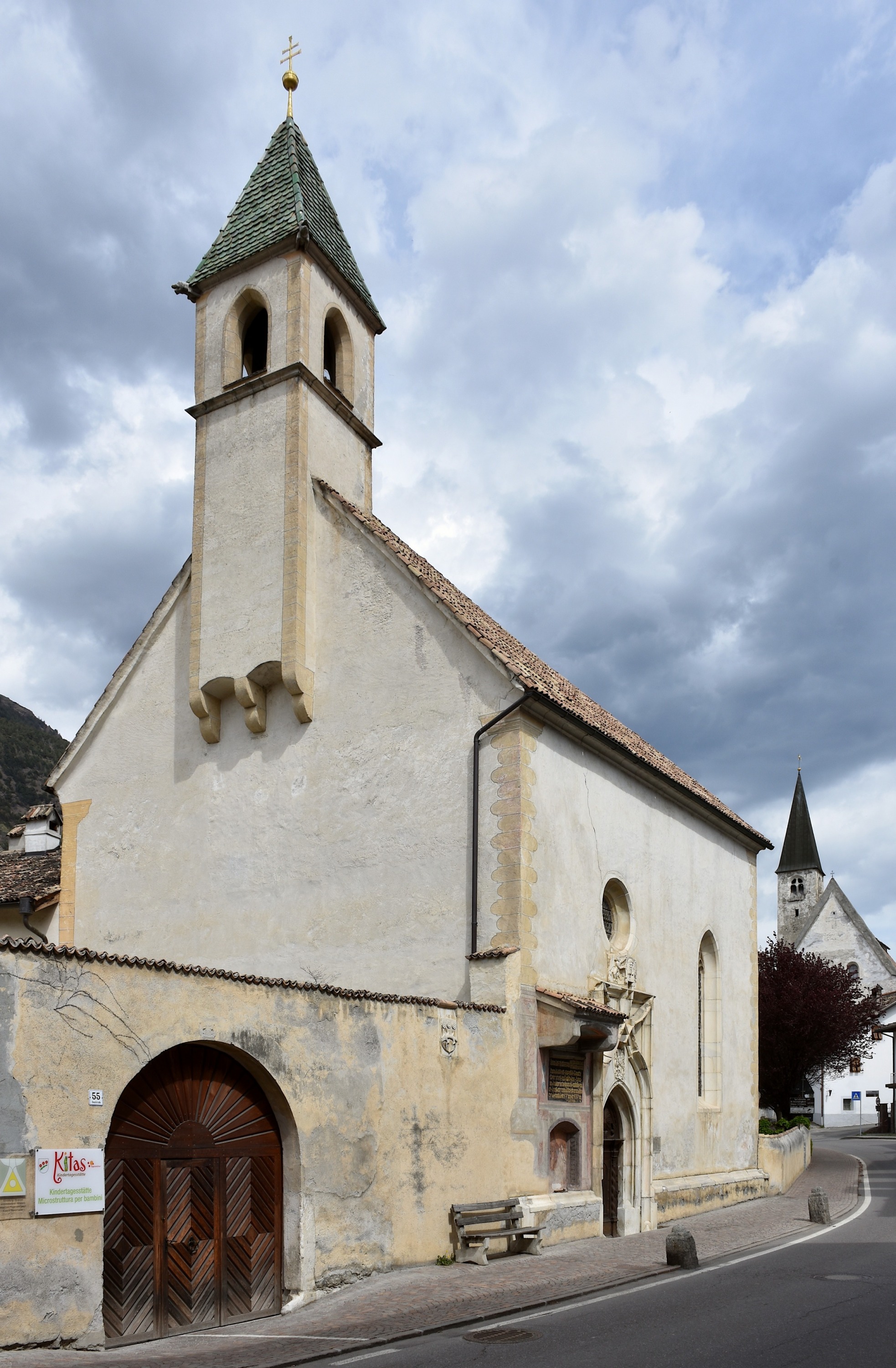 Die reizvolle kleine Spitalkirche in Latsch im Südtiroler Vinschgau wurde ab 1337 an der Stelle eines älteren Baus errichtet. Bekannt ist sie vor allem für den spätgotischen Flügelaltar, der um 1520 von Jörg Lederer geschaffen wurde. Das leicht auskragende Glockentürmchen ist typisch für das Südtirol.